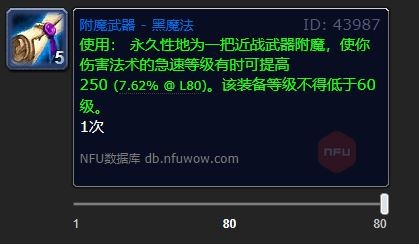 魔兽世界wlk版本里有个强化道具,叫附魔武器黑魔法。小伙伴们肯定想知道这附魔武器黑魔法有啥效果吧?它有一定几率提升施法者的急速等级,而且不会再给施法者的目标施加持续伤害效果了。下面就给大家详细说说这具体的效果。
