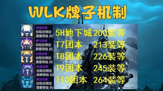 TBC版本就只有一种牌子。可到了WLK版本呢,牌子就分成了5种。这5种牌子是按照不同阶段来划分的,分别是英雄纹章、勇气纹章、征服纹章、凯旋纹章还有寒冰纹章。