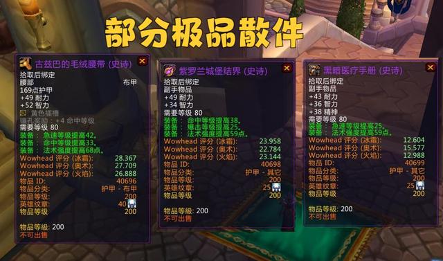 散件里有三件很棒的极品法系装备,分别是古兹巴的毛绒腰带、紫罗兰城堡结界和黑暗医疗手册。