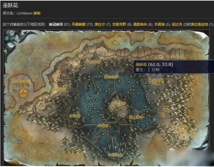 冰冠冰川地图里,巫妖花的采集点多达81个呢。这些采集点大多聚集在地图中央伊米海姆区域的周边地带。比如说,就像一群蜜蜂围绕着蜂巢一样,这些采集点紧紧环绕在伊米海姆区域周围,形成一种相对集中的分布状态。