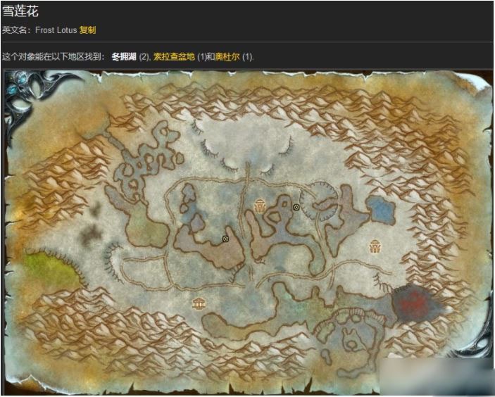 冬拥湖地图里有三个雪莲花的采集之处。有两个采集点在地图的中央地带,还有一个采集点呢,在冬拥湖地图右侧的山脉区域,离索拉查盆地地图不远。