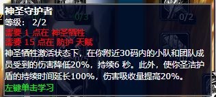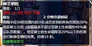 天赋点出的强化神圣牺牲,这就是我们所说的团减。它的效果是这样的:当你使用神圣牺牲以后,整个团队(不是小队哦)就会得到一个减伤效果的增益状态,这个增益能持续6秒,减伤比例达到20%。这个减伤的增益和神圣牺牲本身是相互独立的。打个比方吧,就像两个分开的东西,你要是把承担伤害的神圣牺牲取消掉,这个减伤的增益是不会受到影响的。