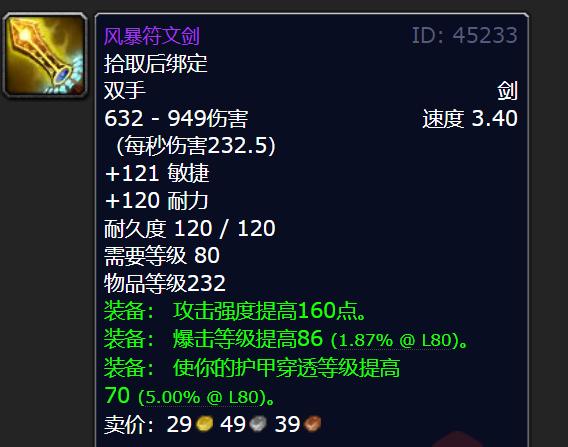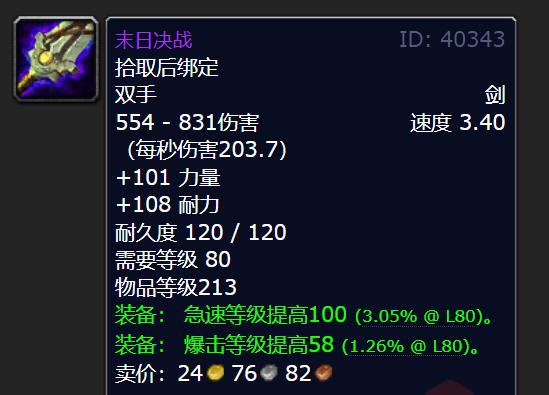 小探要给大家介绍的第一把双手武器,是双手剑“末日决战”,它由纳克萨玛斯的天启四骑士掉落。玩家能在25人难度的NAXX的4DK箱子里得到这把武器,其掉率为10%。这把双手剑是力量型的,物品等级达到213点。在P1阶段,玩家可获取的最佳双手武器里就有它,毕竟它的秒伤能到203点,这个秒伤数值可比SW武器的高很多,能轻松超过SW武器。
