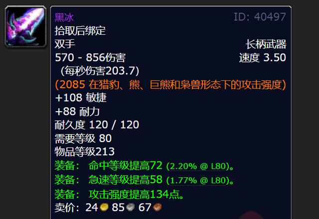 P1阶段有个很棒的双手长柄武器,那就是黑冰。玩家在永恒之眼打败玛利苟斯之后,能拿到阿莱克斯塔萨的礼物,而这个礼物有10%的概率开出黑冰这把武器。黑冰的物品等级是213。近战DPS会想要这把武器,猎人和熊坦也不例外,他们都会去竞争它。