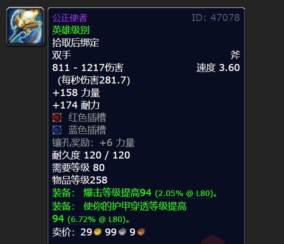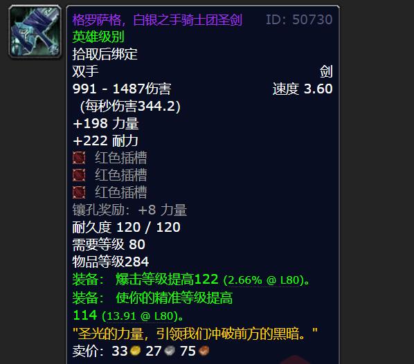 格罗萨格.白银之手骑士团的圣剑,那可是巫妖王之怒里超厉害的双手剑呢。它的装备等级达到284,这和橙斧是一样的哦。而且呀,这把剑有3个红色的插槽,插满之后奖励的属性是8点力量。不管从哪个方面去看这把双手剑,它都非常完美,简直没有任何毛病。