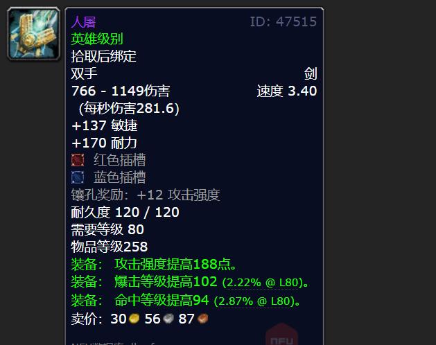 玩家要是把25人TOC副本全部打通的话,就能拿到银色北伐军嘉奖宝箱哦。在这个宝箱里,有15%的可能性会开出敏捷双手剑。这把剑在联盟那儿叫人屠,到了部落就被叫做血肉撕裂者了。这剑的物品等级呢,会根据玩家挑战副本的难度有所不同,挑战的副本难度不一样,剑的物品等级就有245和258这两种情况。