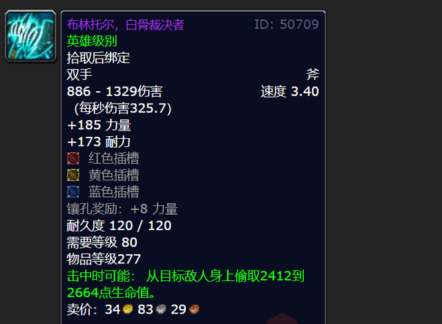 布林托尔,也就是白骨裁决者,它可是非常有名的吸血斧呢。这把武器有个很突出的优点,那就是它会在HICC一区的玛洛加尔领主那儿掉落。要知道,对于普通玩家来说,这可是他们唯一能够获取到的277级别的武器。还有哦,死亡骑士要是用上这把武器,那效果可是相当不错的。