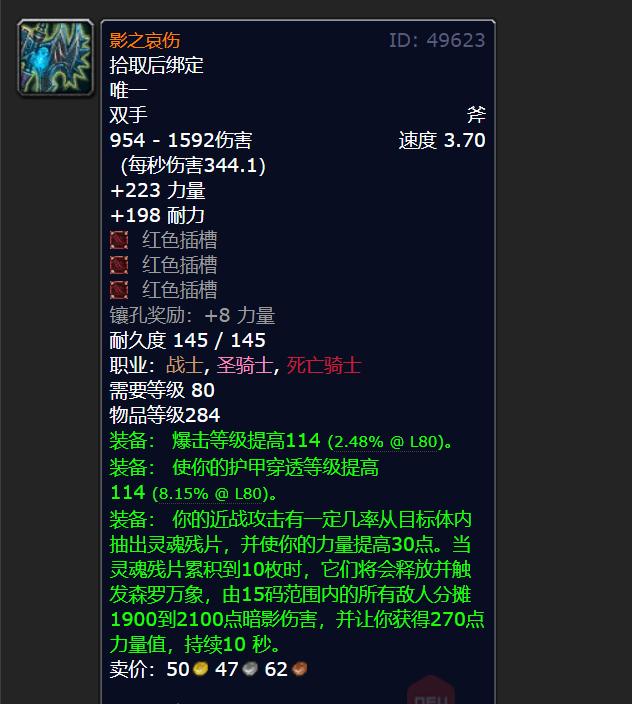 在WLK版本里,橙斧影之哀伤肯定是最强的武器。就算圣剑的秒伤跟影之哀伤比起来并不差,可在绿字属性和特效方面,圣剑还是被影之哀伤远远地甩在后面。影之哀伤是怎么来的呢?它是通过史诗级双手斧影锋加上50个橙色碎片升级得到的。要是玩家没打算把橙斧升级的话,那小探就不推荐去做影锋了。为啥呢?因为影锋这把武器性价比超低,还不如把钱攒着去买吸血斧或者圣剑呢。就好比你有一笔钱,拿去买影锋就像是买了个中看不中用的东西,而买吸血斧或者圣剑可能更划算,能在游戏里给你带来更多实际的好处。