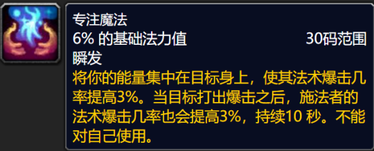 法师有个奥术天赋技能,在第三层。这是PVE法师肯定要点的天赋。通常来说,大部分法师都会交换专注,这么做能让暴击提高6%。不过呢,还有一种玩法,就是把专注卖给其他法系DPS,帮他们冲榜。要知道,暴击多3%的影响可不小呢。