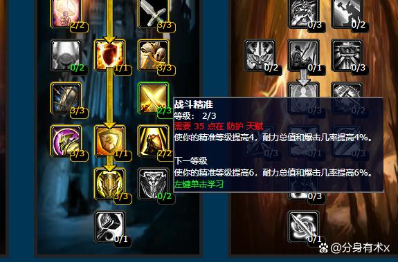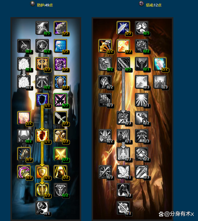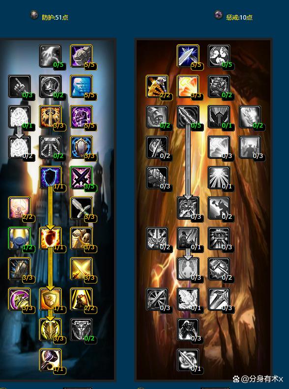 防骑的技能变强了,天赋也变强了。既然这样,咱们就得改变天赋加点的方式。今天,分身就来跟大家聊聊WLK前夕防骑的两套天赋加点。这两套呀,一套主要是为下副本准备的,另一套呢,则主要是用于单刷的。