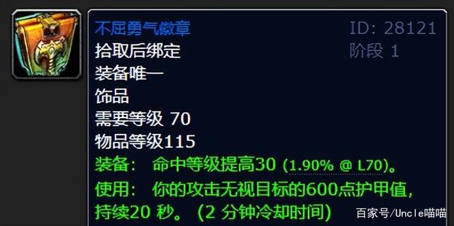 你乍一看到这55点命中等级提升,就能想象到它在前期的地位了。不管哪个版本,命中的优先级都相当高。所以,它对初期的物理DPS有着极大的吸引力。更厉害的是,它主动爆发时能提升670点攻击强度,而且持续20秒,这可是DPS强有力的保障啊。它的冷却时间是2分钟,就续航来说,也是很全面了。喵叔看着它,思绪忍不住飘飞起来,脑海中浮现出TBC版本的不屈勇气徽章。