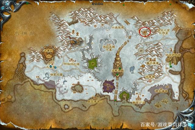 在龙骨荒野的北方,有个霜之哀伤洞穴,就在下图红圈所标的地方。这儿没多少任务,所以很少有玩家会来。到了制作橙斧的最后阶段呢,玩家才会被要求到这儿来做任务。
