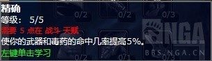 命中收益分三个档次,每进一档,收益就会下降。技能的命中需求是99(其中有5点为[精确],没有[强化精灵火]这种情况)。毒药的命中需求比较复杂,在不同条件下数值不同,如果是5点精确,没有强化精灵火和[德莱尼光环]时,需求为315;要是5点精确,有德莱尼光环但没有强化精灵火,那需求就是289;当5点精确,有强化精灵火但没有德莱尼光环,需求为237;而5点精确,既有强化精灵火又有德莱尼光环时,需求则为210。