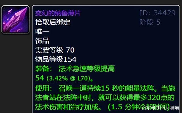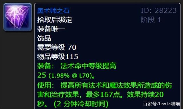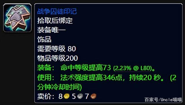刚提到奥法之书没有命中加持,现在就有个好东西。紫罗兰监狱英雄模式出的战争囚徒印记,它能让你不用担心命中的问题。而且,这东西还是主动法伤高爆发的绝佳物品呢。它的续航时间是20秒,冷却CD为2分钟,在前期配装补命中的时候,它就像神器一样。这就好比在TBC年代,希尔斯布莱德丘陵的BOSS时空猎手掉落的奥术师之石一样。