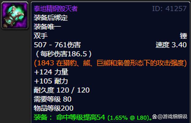 WLK怀旧服P1刚开始的时候,邪DK开荒用啥武器好呢?首选就是锻造做出来的双手锤——泰坦精钢毁灭者。别再想别的武器啦,就用这个。这锤子能给54点命中等级呢,力量加得也不少。要知道,前期命中可是很关键的,必须得有一定的命中数值才行。这个双手锤是装备绑定的,这就意味着能自由交易,想得到它没那么难,也就是刚开服的时候价格可能会稍微高点儿。