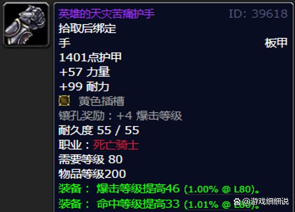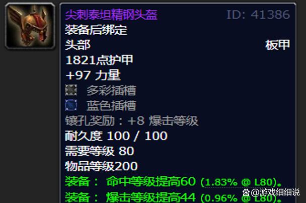 尖刺泰坦精钢头盔对邪DK开荒来说是超棒的装备。在4T7搭配的时候,大家都会留着它,一直到奥杜尔阶段才会有其他装备能替代它。这头盔的属性相当厉害呢,命中等级加得很多,而且还有多彩插槽。有个很棒的点哦,这个头盔是可以自由交易的,它是通过锻造做出来的。你得知道,只要是装绑的装备,属性又好,那肯定是不错的选择。 说到多彩宝石,我觉得打一颗加21敏捷和3%暴击伤害的比较好。还有个蓝槽,在初期的时候用加10全属性的宝石就行啦,这样就能凑出多彩效果了。在附魔这块儿没什么可犹豫的,必须是那种加50攻强和20暴击等级的附魔。