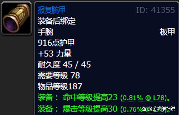 有一件装备是锻造而成的,那就是报复腕甲,这玩意对于邪DK开荒来说,就像是标准配置一样。你可以直接用锻造技能给这个腕甲弄个插槽,插宝石的时候,可别忘了要考虑多彩宝石的效果哦。贫血?这你完全不用操心。真的,听我的就对了,到时候直接从拍卖行(AH)买一个就行,再给它附个魔,附上50点攻击强度(AP)的那种。比如说,之前我玩邪DK开荒的时候,就这么干的,一路顺风顺水,这报复腕甲真的挺好用的。