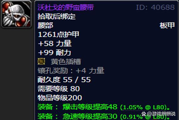邪DK用沃杜戈的野蛮腰带要比10人模式NAXX格拉斯掉落的飞升幽灵束带更合适,这腰带获取特别容易,拿牌子换就行。宝石呢,可以打一颗加8力量和8暴击等级的,这样就能有镶孔奖励。附魔就选工程学特有的弹带。