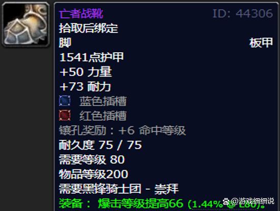 你玩DK的话,黑锋骑士团阵营的声望怎么能不到崇拜呢?声望一旦达到崇拜,就能拿到一双开荒用的鞋子,属性超棒,这鞋子就是亡者战靴。拿到鞋之后,打上两颗16力量的宝石就成。要是纯PVE玩家,附魔32AP比较好。