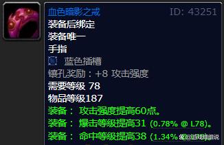 我推荐两枚戒指,一枚是肯瑞托戒指,另一枚是珠宝制作出来的血色暗影之戒。邪DK是一定要有肯瑞托戒指的,这个戒指有精准等级,力量属性很不错,还带有一些暴击等级,并且它能够成长。至于血色暗影之戒,在开荒的时候选择它是很不错的。要是给这个戒指镶嵌宝石的话,镶嵌16力量的那种宝石就挺好。