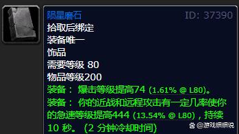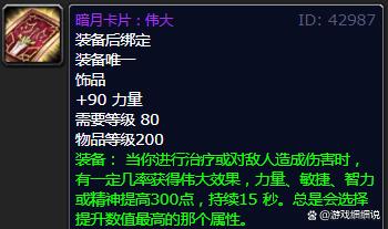 在两个饰品里,我觉得力量版暗月卡牌:伟大是无可取代的。还有一个饰品呢,我推荐陨星魔石。对于邪DK而言,这陨星魔石就像是个小神器。邪DK在触发它的特效之后再召唤石像鬼的话,那DPS能得到双重放大呢。给大家举个例子来解释下,比如说邪DK在战斗中,陨星魔石触发特效后,此时角色身上有个增益状态(也就是BUFF),当召唤石像鬼时,这个BUFF对石像鬼也有加成效果,这样就使得整体的伤害输出(DPS)得到了双重的提升。