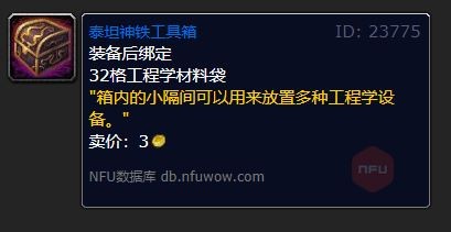 在《魔兽世界》里,有个背包道具叫泰坦神铁工具箱。估计好多玩家都还不晓得这玩意儿有啥用呢。现在呀,就来给那些不清楚的朋友讲讲,《魔兽世界》里的泰坦神铁工具箱到底有啥用处。