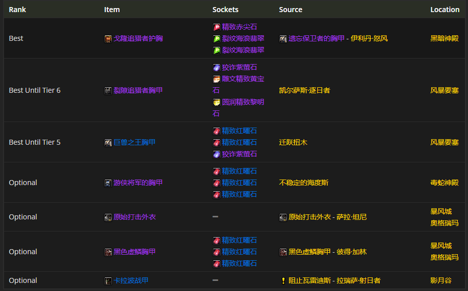 要是挑胸部装备的话,戈隆追猎者胸甲是首选呢。至于附魔嘛,附魔胸甲 - 杰出属性是比较推荐的。