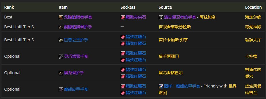 要是挑选手部装备的话,戈隆追猎者手套是首选。至于附魔嘛,比较推荐附魔手套 - 超强敏捷。