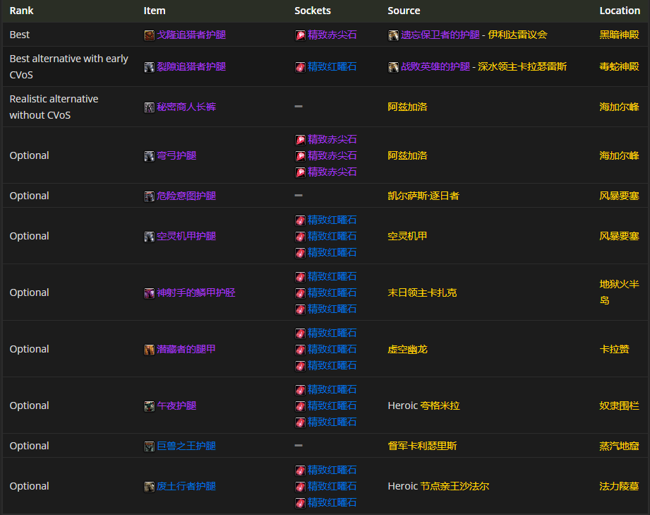 要是挑选腿部装备的话,戈隆追猎者护腿是首选。而在附魔方面呢,虚空毒蛇腿甲片是比较推荐的。