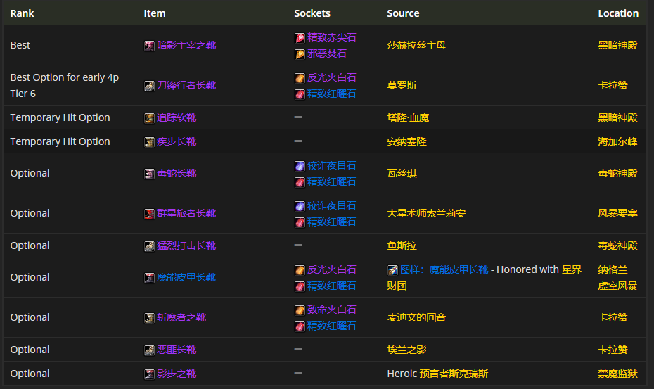 脚的装备呢,首先要选暗影主宰之靴。至于附魔呀,附魔长靴 - 灵巧是比较推荐的。