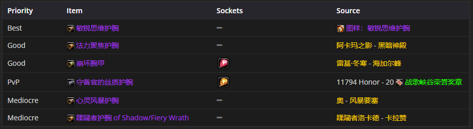 如果要选手腕装备的话,敏锐思维护腕是首选。至于附魔呢,比较推荐附魔护腕 - 特效法术能量、法术打击这两种。