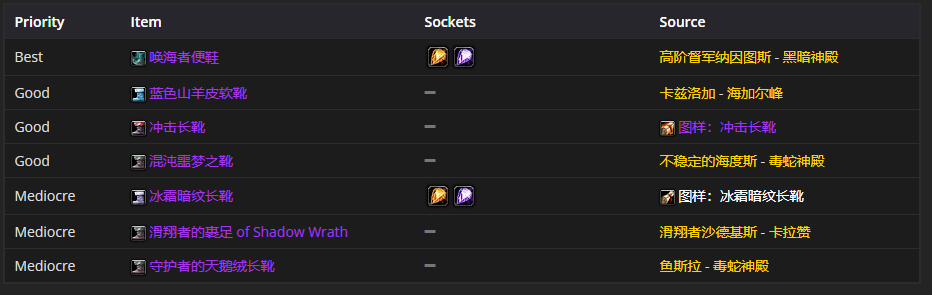 要是挑选脚装备的话,唤海者便鞋是首选。至于附魔嘛,推荐选择附魔长靴 - 野猪之速。
