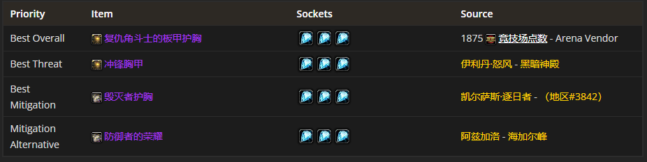 胸部装备的话,首先推荐复仇角斗士的板甲护胸。至于附魔嘛,附魔胸甲 - 杰出属性、特效韧性是很不错的选择。