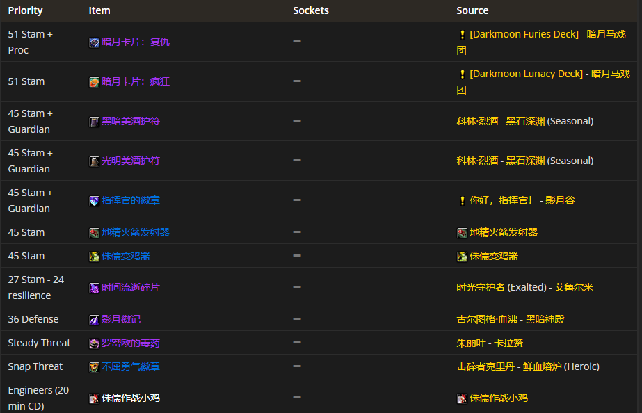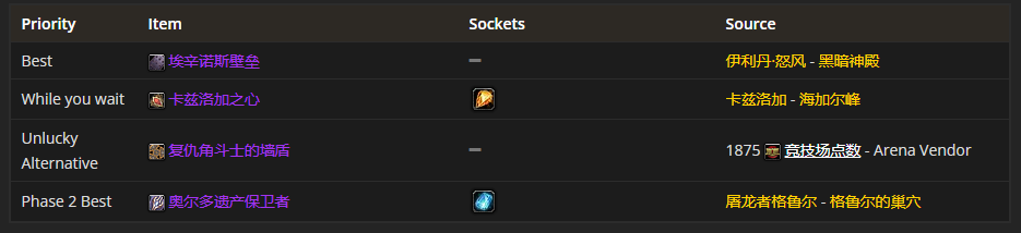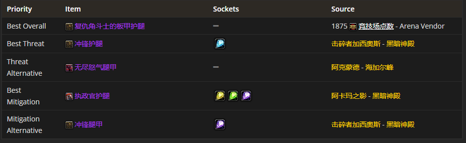 如果要选肩部装备的话,复仇角斗士的板甲护肩是首选。而在附魔方面,天灾的坚韧、强力骑士或者护卫铭文是比较推荐的。
