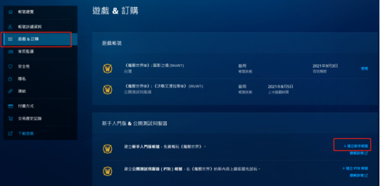 当你确认月卡充值成功之后,就可以登录台服官网啦。接着登录你的邮箱账号,再点击“游戏&订购”选项,之后点击“建立PTR账号”,这样就能成功建立PTR账号了。