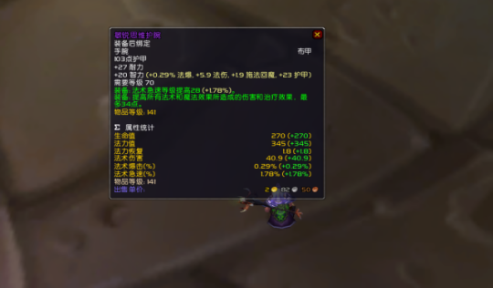 敏锐思维护腕是个布甲护腕,它是裁缝做的,还能装绑呢。这个护腕的主属性包括27点耐力和20点智力,绿字属性方面,有28点急速以及34点法术强度。