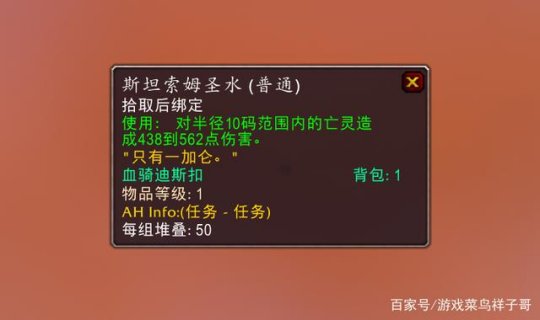 咱们首先得准备一样东西,那就是斯坦索姆圣水。这斯坦索姆圣水呢,只能在斯坦索姆副本的补给箱里找到,而且获取的概率不怎么高。大家应该都很明白斯坦索姆圣水的用途吧,它主要是用来对付亡灵怪的。不管是那种负责输出的职业,还是当MT(主坦克)的职业,祥子哥都觉得大家应该去刷点斯坦索姆圣水。就拿防骑来说吧,防骑在海加尔山副本里主要是拉小怪的,要是有斯坦索姆圣水的配合,拉怪仇恨就特别稳,所以呀,防骑是必须得去刷这斯坦索姆圣水的。