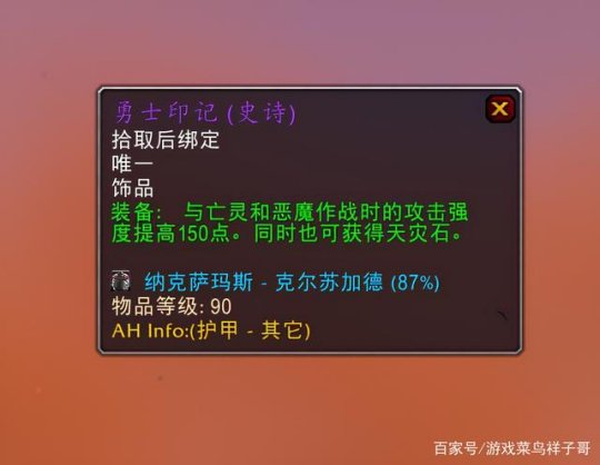 魔兽世界60级版本里有个叫勇士印记的饰品,这东西是从NAXX副本产出的。玩过60级怀旧服的玩家,大多都知道这个勇士印记。勇士印记有两种类型,其中一种能让法术对亡灵和恶魔的伤害提升85点呢。你要知道,在TBC怀旧服现有的饰品里,没有哪个饰品的伤害加成能比这个高的。这就意味着,法系职业要是带上勇士印记,到P3阶段的那两个副本里,效果会特别棒。