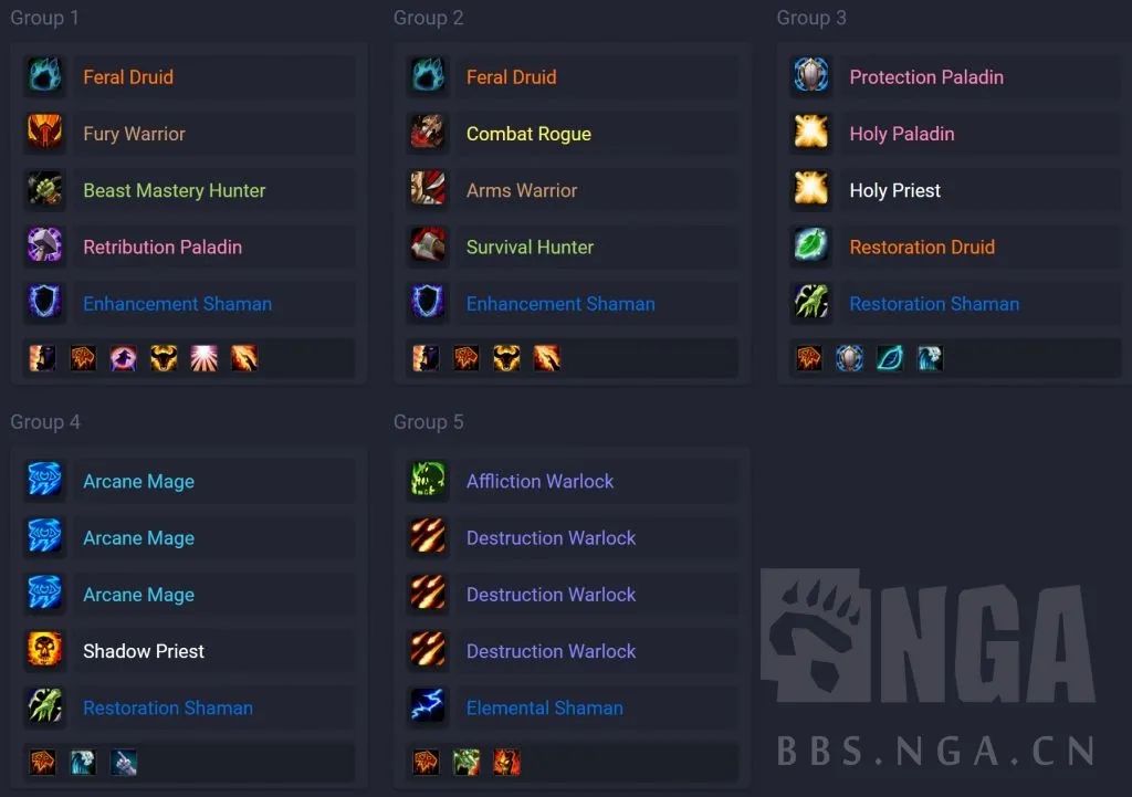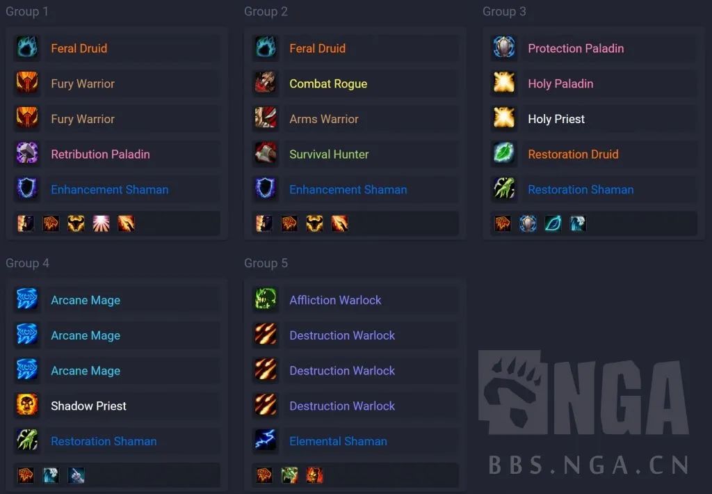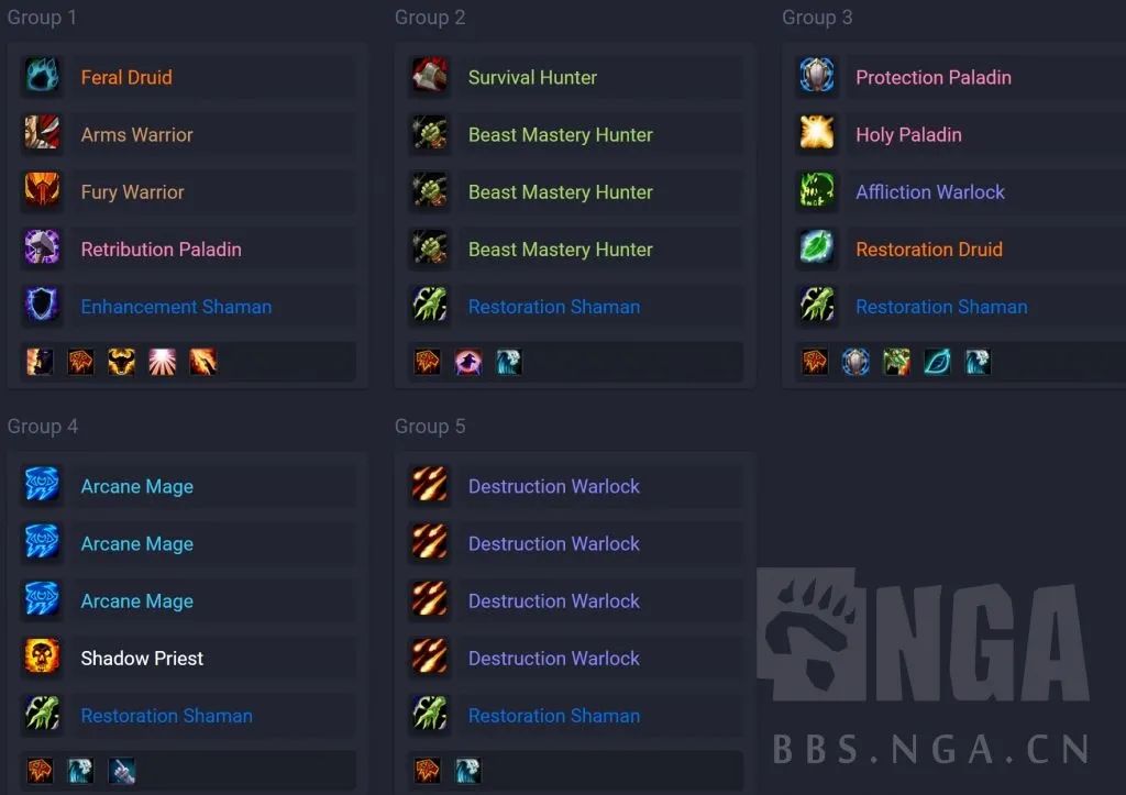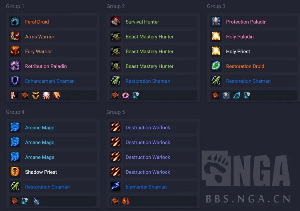 要是常规有6个奶的话,法术队里就把元素换成奶萨,把神牧换成术士。要是只有5个奶呢,那就把猎人队里的换成增强。