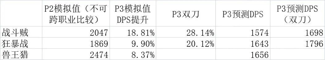 1. 要是模拟器准的话,在P3阶段,战斗贼和狂暴战、兽王猎之间的差距就变小了。