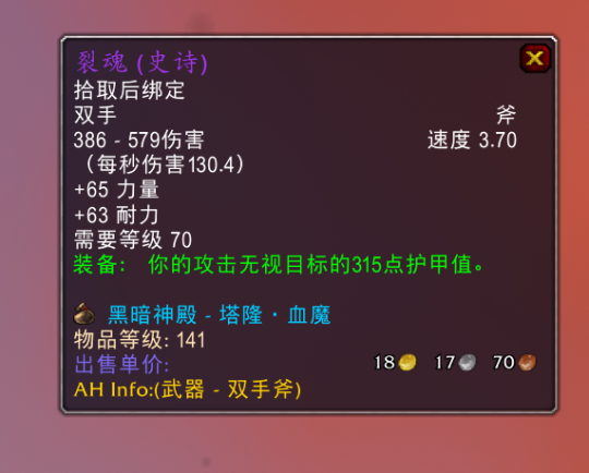 在魔兽世界的TBC版本里,有两把超棒的双手剑武器。其中一把是奥伯莱恩·裂魂之剑,这可是版本毕业的武器呢。另一把则是来自海加尔山的灾变之刃。 灾变之刃的伤害在386到580点之间,它的攻速是3.50,每秒伤害能达到138点,这相当高了。而且它还附加75点力量和49点耐力,绿字属性是能够忽视335点护甲值。拿它和黑暗神殿里的裂魂双手斧作比较的话,灾变之刃比裂魂双手斧要厉害很多呢。就好比在实际战斗场景中,面对同样防御的敌人,灾变之刃因为有忽视护甲值的属性,能打出更高的伤害,而裂魂双手斧相对就会弱一些。