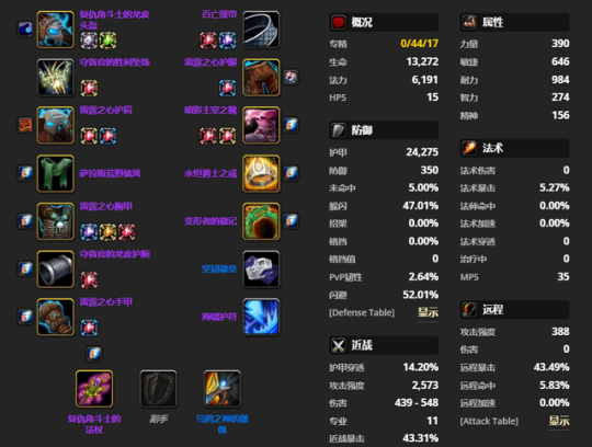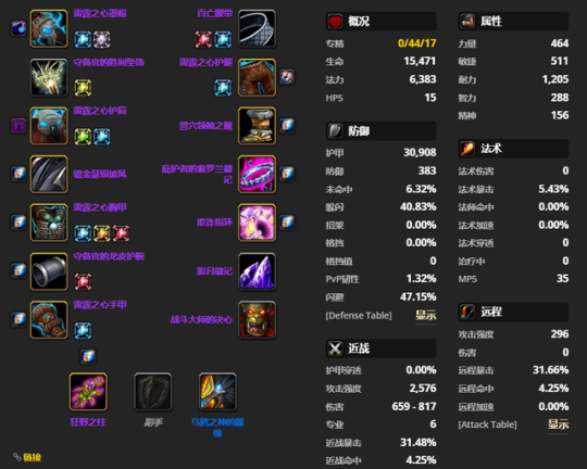 这一身装备能为玩家提供15471点生命值呢。它还能给予7078点护甲,要是巨熊的话则有30908点护甲,这么多的护甲能够提供72.1%的物理减伤哦。除此之外,它还能带来40%的躲闪几率。这一套装备搭配吧,躲闪似乎是低了些。不过呢,它能让玩家变得很“抗揍”,毕竟生命值和护甲都比较可观,而且还有两个生命饰品来兜底呢。所以啊,这绝对是走生存流派的绝佳选择。另外呀,这装备还能给2576点的攻击强度(AP),暴击率能达到31.48%,命中率为4.25%。就因为有这样的属性,它在拉仇恨方面也没问题的。打个比方说,要是有每秒能打出2800点以上伤害(DPS)的玩家,用这套装备也能轻松把仇恨拉住。