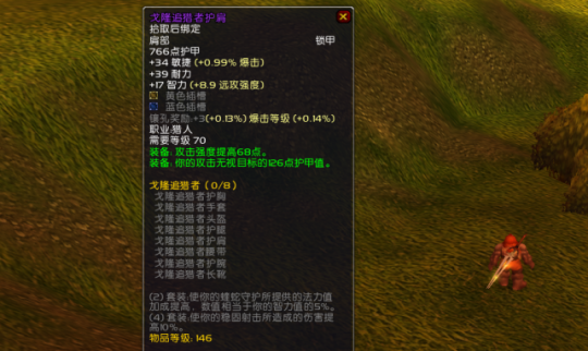猎人的T6肩膀,装备等级是146。它的主属性包含34点敏捷、39点耐力还有17点智力,这敏捷属性还比不上驯兽者护肩呢。T6肩膀的绿字属性有68点攻强和126点破甲值,而且还带2个宝石孔。