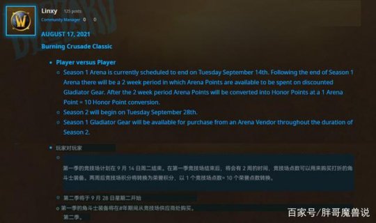 前阵子,外服有一则蓝贴,吸引了众多玩家的目光。暴雪在这则蓝贴里表明,竞技场第一赛季会在9月14日结算,而第二赛季于9月28日开启。暴雪很快就把这蓝贴删了,可玩家们已经留存了相关信息。
