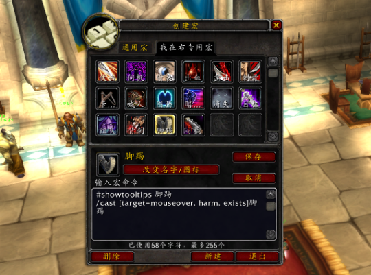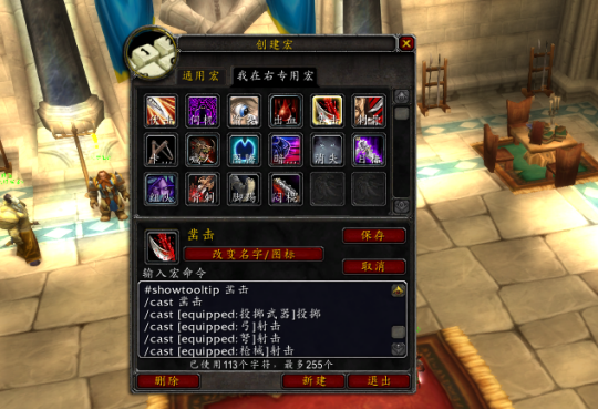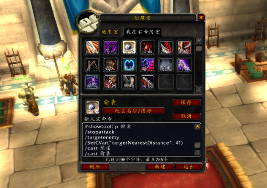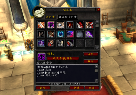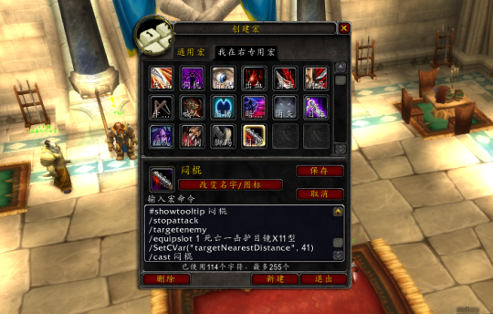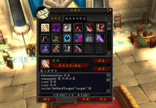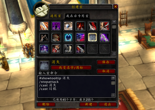 这个宏挺简单的,就是在消失之后马上使用闷棍技能。有些厉害的盗贼在打竞技场或者单挑的时候,会给这个宏再加一个伏击技能。不过我通常不会把伏击和消失绑在一起。消失是用来保命的,为了放一个伏击就用掉消失,我感觉挺不划算的。打个比方吧,就像你手里只有一个很珍贵的保命道具,却为了多打一点伤害就把它用掉了,这显然不太明智。