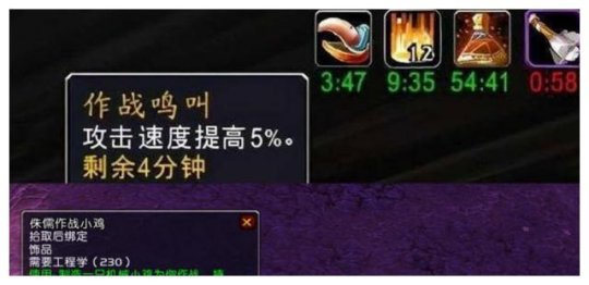 作战鸣叫在打怪的时候,原本是随机触发的,触发概率不定,而且这个效果能持续4分钟。就算脱离战斗或者更换饰品,这个BUFF也不会消失。在60级的时候,作战鸣叫存在不稳定的情况。不过现在呢,有个能让它100%触发的法子。这个法子就是玩家处于战斗状态时,要是同时被恶意技能影响,这时候使用作战小鸡就可以直接触发这个BUFF。那什么是恶意技能影响呢?像副本里小怪的普通攻击、范围伤害(AOE伤害),还有各种各样的负面效果(DEBUFF)都算。只要在战斗中受到了这些影响,召唤小鸡就必定能得到急速效果。