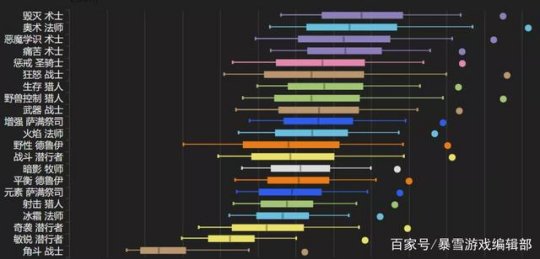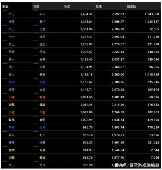 在别的方面,狂暴战还是很强势的,它和生存猎、兽王猎分别排在第4名到第6名。再往后呢,就是增强萨、火法、野德以及战斗贼了。暗牧、平衡德和元素萨的排名比较靠后。像射击猎、冰法和其他盗贼这些天赋,要么数量特别少,要么就太非主流了,所以咱们就先不管它们了。