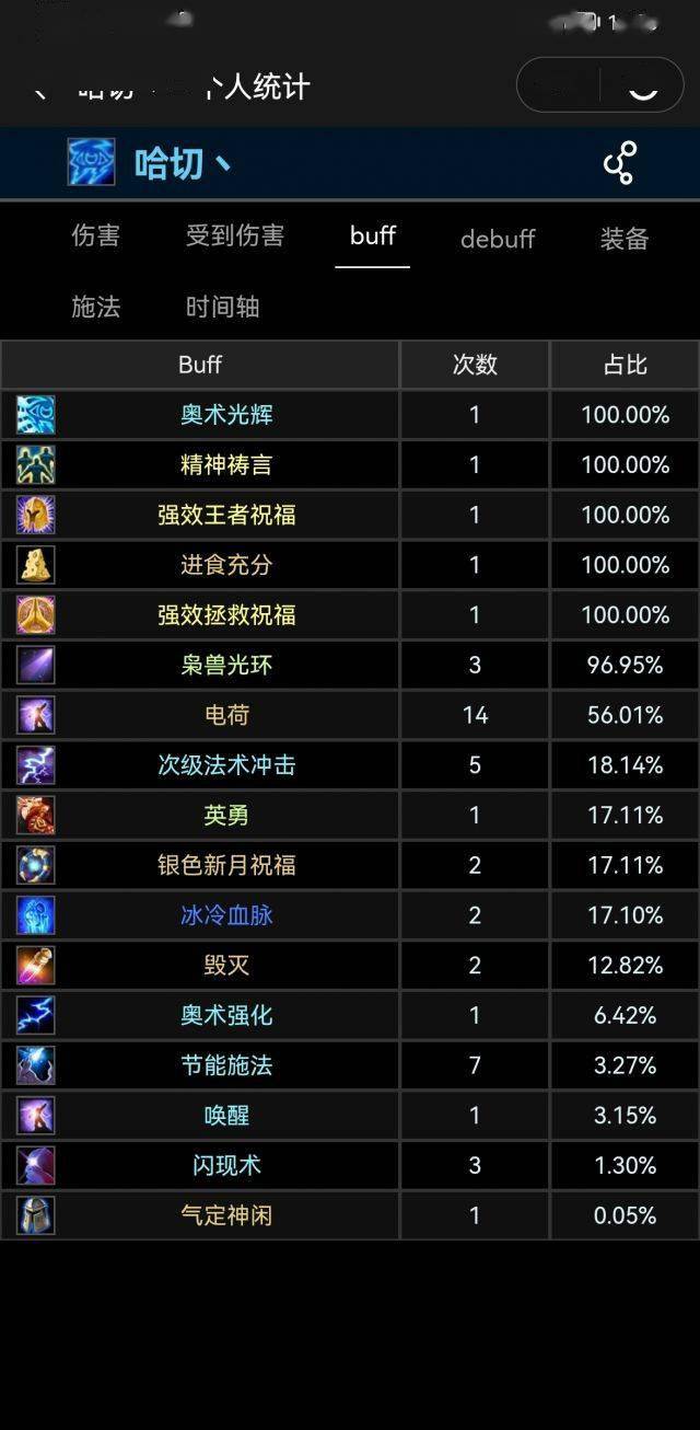 一开始的buff和分组,没什么特别之处。英勇就吃到了一次,咕咕光环倒是一直保持着。节能的触发率特别低,仅仅只有7%。这里既没有智慧祝福,也没有灌注,还没有激活。团队里有暗牧的话,就假设能够享受到暗牧的回蓝效果,这样的配置应该差不多。