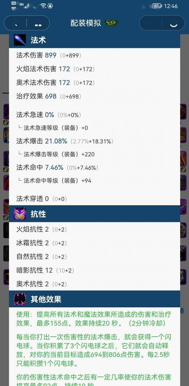 我照着完全相同的配置使用模拟器。要是算上满增益状态的话,法强大概能达到1200多呢,蓝量差不多是1.2左右,每秒靠着精神能回蓝150,命中能达到满值,暴击在23到25之间。宝石呢,默认全是14颗智力宝石,我个人觉得奥法的智力收益挺好的,性价比挺高的,不过这也没什么数据能证明。就像我自己玩奥法的时候,感觉技能伤害跟智力有很大关系,虽然没去仔细统计,但就是一种直观的感受,这也能从侧面说明为啥我觉得智力性价比高。
