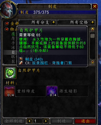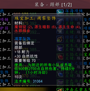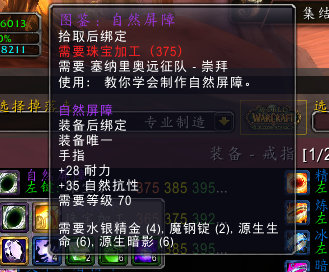 戒指是珠宝专业打造的自然抗性的得力帮手,不过其图纸得塞纳里奥远征队声望达到崇拜才能获取。如果有了戒指,再加上附魔,那自然抗性就能达到255点了。胸甲、腿部、手套和鞋子这四个部位还能使用自然护甲片呢,如此一来,自然抗性就会达到287点。等到有了各种buff和图腾的加成,轻轻松松就能让自然抗性达到375点。除了这些部位,其他部位就穿着自己日常的装备就好啦。